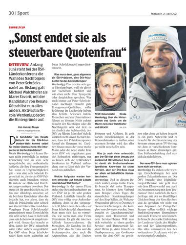 Interview. Michael Walchhofer galt als designierter neuer ÖSV-Präsident. Jetzt stellt sich auch Renate Götschl zur Wahl – auf Empfehlung von Peter Schröcksnadel. Nicola Werdenigg erklärt exklusiv die Hintergründe. Seiten 30/31 GEPA