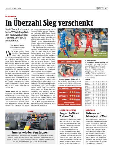 Der FC Dornbirn kommt beim SV Stripfing/Weiden nach wechselnder Führung über ein 2:2 nicht hinaus.