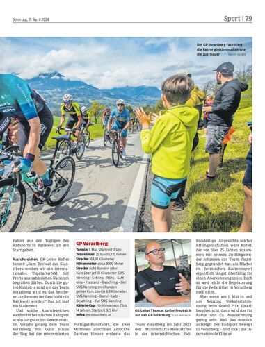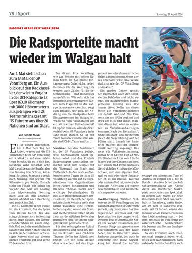 Am 1. Mai steht schon zum 13. Mal der GP Vorarlberg an. Ein Ausblick auf den Radklassiker, der wie im Vorjahr in der UCI-Kategorie 1.2 über 163,10 Kilometer mit 3000 Höhenmetern ausgetragen wird. 25 Teams mit insgesamt 175 Fahrern aus über 20 Nationen sind am Start.