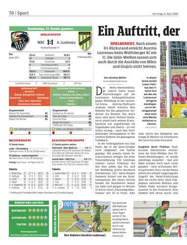 Spielbericht. Nach einem 0:1-Rückstand erreicht Austria Lustenau beim Wolfsberger AC ein 1:1. Die Grün-Weißen lassen sich auch durch die Ausfälle von Mikic und Grujcic nicht beirren.