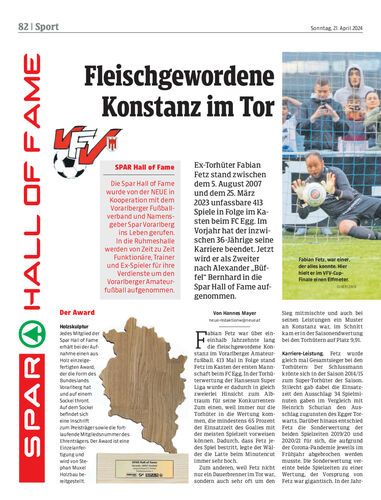 Ex-Torhüter Fabian Fetz stand zwischen dem 5. August 2007 und dem 25. März 2023 unfassbare 413 Spiele in Folge im Kasten beim FC Egg. Im Vorjahr hat der inzwischen 36-Jährige seine Karriere beendet. Jetzt wird er als Zweiter nach Alexander „Büffel“ Bernhard in die Spar Hall of Fame aufgenommen.