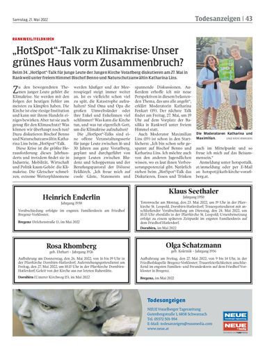 Beim 34. „HotSpot“-Talk für junge Leute der Jungen Kirche Vorarlberg diskutieren am 27. Mai in Rankweil unter freiem Himmel Bischof Benno und Naturschutzanwältin Katharina Lins.