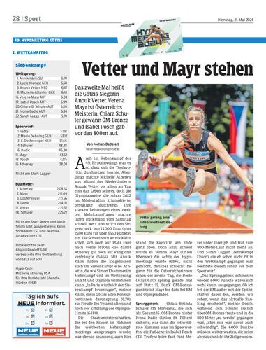 Das zweite Mal heißt die Götzis-Siegerin Anouk Vetter. Verena Mayr ist Österreichs Meisterin, Chiara Schuler gewann ÖM-Bronze und Isabel Posch gab vor den 800 m auf.