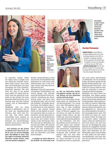 Interview. Die Tiroler Landtagsvizepräsidentin und ÖVP-Kandidatin bei der Europawahl Sophia Kircher war kürzlich in Vorarlberg zu Besuch. Im Interview spricht sie gemeinsam mit der ÖVP-Landtagsabgeordneten Christina Hörburger über die EU, junge Menschen und darüber wie es ist, in der Öffentlichkeit zu stehen.