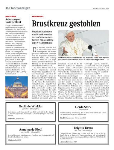 Unbekannte haben das Brustkreuz des verstorbenen emeritierten Papstes Benedikt XVI. gestohlen.