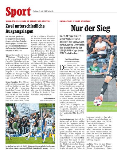 Die Röthner gelten im heutigen Heimspiel des österreichischen Pokalbewerbs gegen Titelverteidiger Sturm Graz als krasser Außenseiter. Die Bregenzer müssen in Imst ran.