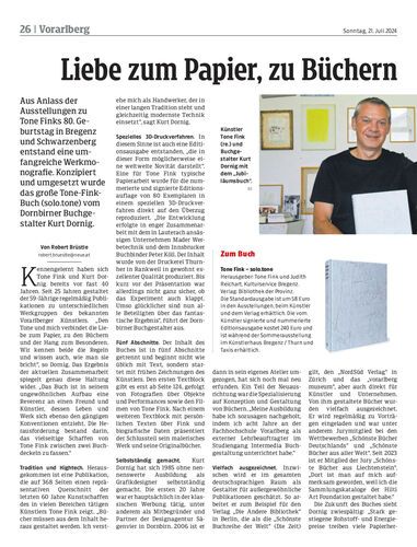 Aus Anlass der Ausstellungen zu Tone Finks 80. Geburtstag in Bregenz und Schwarzenberg entstand eine umfangreiche Werkmonografie. Konzipiert und umgesetzt wurde das große Tone-Fink-Buch (solo.tone) vom Dornbirner Buchgestalter Kurt Dornig.