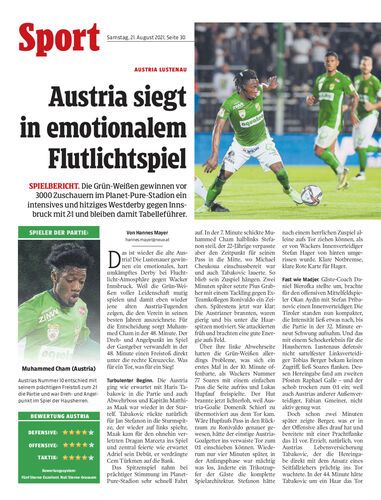 Spielbericht. Die Grün-Weißen gewinnen vor 3000 Zuschauern im Planet-Pure-Stadion ein intensives und hitziges Westderby gegen Innsbruck mit 2:1 und bleiben damit Tabelleführer.
