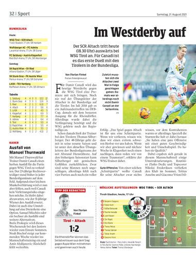 Der SCR Altach tritt heute (18.30 Uhr) auswärts bei WSG Tirol an. Für Canadi ist es das erste Duell mit den Tirolern in der Bundesliga.
