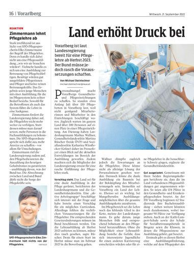 Vorarlberg ist laut Landesregierung bereit für eine Pflegelehre ab Herbst 2023. Der Bund müsse jedoch rasch die Voraussetzungen schaffen.