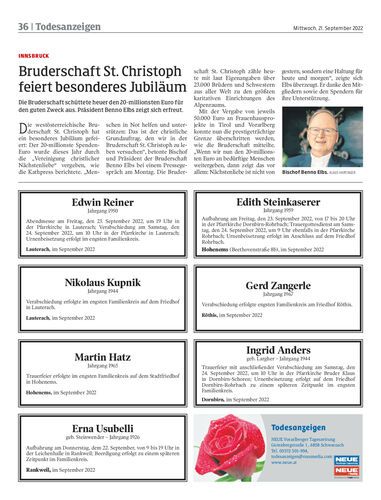 Die Bruderschaft schüttete heuer den 20-millionsten Euro für den guten Zweck aus. Präsident Benno Elbs zeigt sich erfreut.