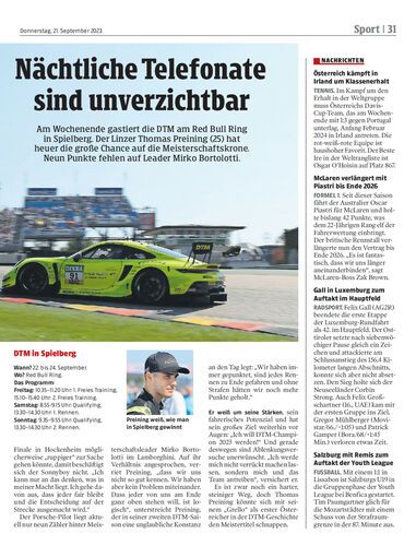 Am Wochenende gastiert die DTM am Red Bull Ring in Spielberg. Der Linzer Thomas Preining (25) hat heuer die große Chance auf die Meisterschaftskrone. Neun Punkte fehlen auf Leader Mirko Bortolotti.
