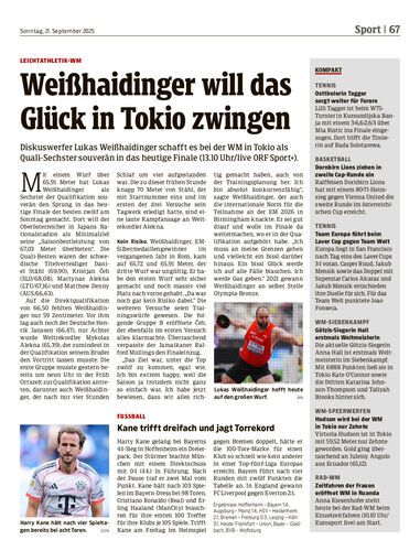 Diskuswerfer Lukas Weißhaidinger schafft es bei der WM in Tokio als Quali-Sechster souverän in das heutige Finale (13.10 Uhr/live ORF Sport+).