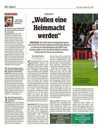 Vorschau. Der SCR Altach empfängt heute um 14.30 Uhr in der siebten Bundesliga-Runde zu Hause im Schnabelholz die WSG Tirol. Erneut geht es für die Rheindörfler darum, eine positive Serie auszubauen.