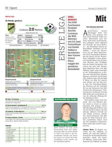 Spielbericht. Vor 2400 Zuschauern besiegte Austria Lustenau die WSG Wattens mit 2:0. Zwei Freistoßtore von Daniel Sobkova bescherten Neo-Trainer Gernot Plassnegger ein perfektes Heimdebüt.