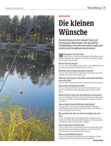 Flavio Carrara ist mit seinem Vater auf Fischfang in Meiningen. Der sportliche Zwölfjährige wünscht sich einen Vogel und möchte das Strafgesetzbuch lernen.