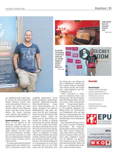 Hinter Dornbirner Mauern gibt es ein Paralleluniversum, von dem kaum einer etwas ahnt: den „Secret Room“. Dort führen thematisch aufbereitete Spiele eine Gruppe hinein in eine andere Welt. Harald Geiger hat diese erschaffen. Und die Welt wächst ständig.