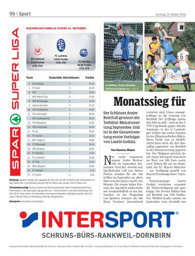 Der Schlinser Andre Breitfuß gewinnt die Torhüter-Monatswertung September. Und ist in der Gesamtwertung erster Verfolger von Laurin Godula.