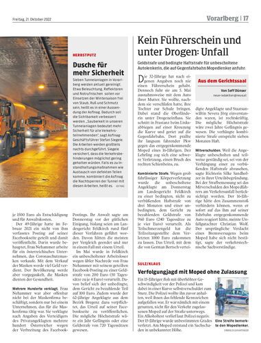 Geldstrafe und bedingte Haftstrafe für unbescholtene Autolenkerin, die auf Gegenfahrbahn Mopedlenker anfuhr.