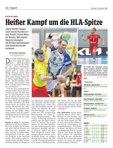 „Rote Teufel“ liegen nach sechs Runden einen Punkt hinter Meister Krems. Mit einem Sieg im heutigen (18.30 Uhr) Spitzenspiel will Hard Revanche nehmen.