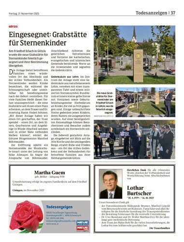 Am Friedhof Erlach in Götzis wurde die neue Grabstätte für Sternenkinder feierlich gesegnet und ihrer Bestimmung übergeben.