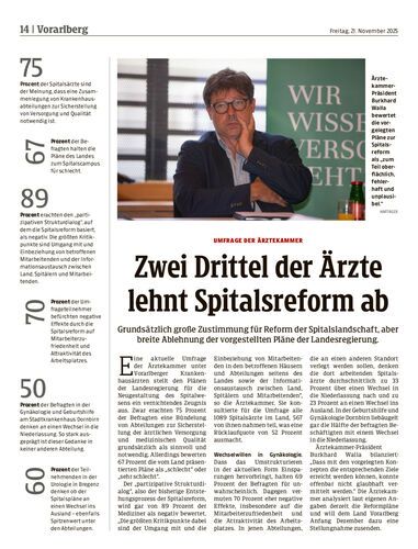 Grundsätzlich große Zustimmung für Reform der Spitalslandschaft, aber breite Ablehnung der vorgestellten Pläne der Landesregierung.