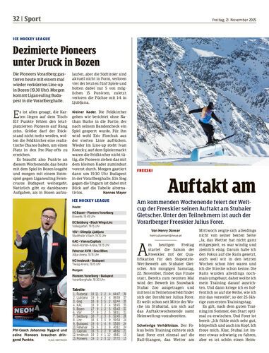 Die Pioneers Vorarlberg gastieren heute mit einem mal wieder verkürzten Line-up in Bozen (19.30 Uhr). Morgen kommt Liganeuling Budapest in die Vorarlberghalle.