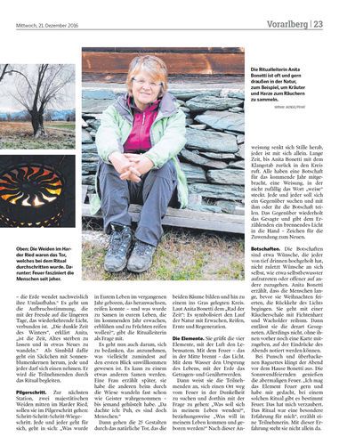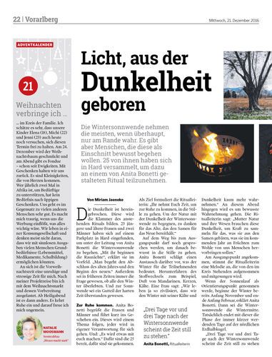 Die Wintersonnwende nehmen die meisten, wenn überhaupt, nur am Rande wahr. Es gibt aber Menschen, die diese als Einschnitt bewusst begehen wollen. 25 von ihnen haben sich in Hard versammelt, um dazu an einem von Anita Bonetti gestalteten Ritual teilzunehmen.