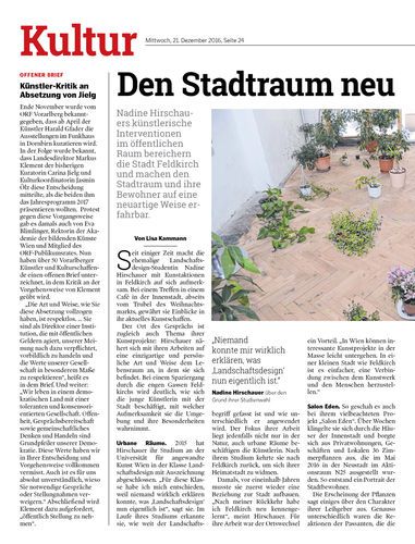 Nadine Hirschauers künstlerische Interventionen im öffentlichen Raum bereichern die Stadt Feldkirch und machen den Stadtraum und ihre Bewohner auf eine neuartige Weise erfahrbar.