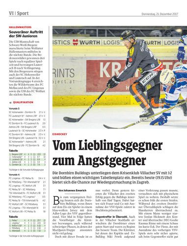 Die Dornbirn Bulldogs unterliegen dem Krisenklub Villacher SV mit 1:2 und büßen einen wichtigen Tabellenplatz ein. Bereits heute (19.15 Uhr) bietet sich die Chance zur Wiedergutmachung in Zagreb.