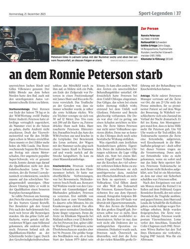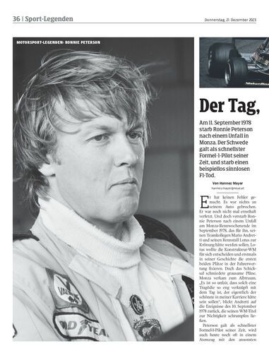 Am 11. September 1978 starb Ronnie Peterson nach einem Unfall in Monza. Der Schwede galt als schnellster Formel-1-Pilot seiner Zeit, und starb einen beispiellos sinnlosen F1-Tod.