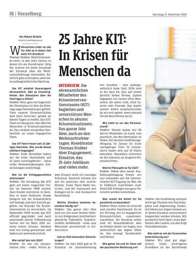 Interview. Die ehrenamtlichen Mitarbeiter des Kriseninterventionsteams (KIT) begleiten und unterstützen Menschen in akuten Krisensituationen. Das ganze Jahr über, auch an den Weihnachtsfeiertagen. Koordinator Thomas Stubler über Engagement, Einsätze, das 25-Jahr-Jubiläum und vieles mehr.