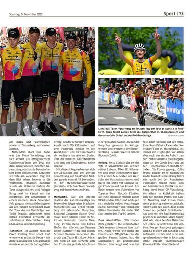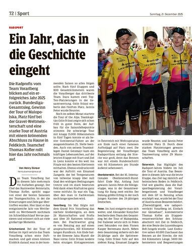Die Radprofis vom Team Vorarlberg blicken auf ein erfolgreiches Jahr 2025 zurück. Bundesliga-Gesamtsieg, Gewinn der Tour of Malopolska, Platz fünf bei der Gravel-Weltmeisterschaft und eine starke Tour of Austria mit einem krönenden Abschluss zu Hause in Feldkirch. Teamchef Thomas Kofler rollt hier das Jahr nochmals auf.