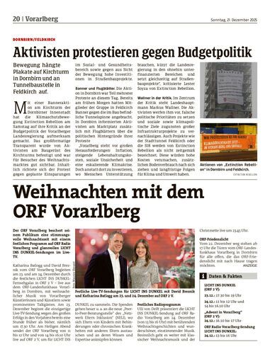 Bewegung hängte Plakate auf Kirchturm in Dornbirn und an Tunnelbaustelle in Feldkirch auf.