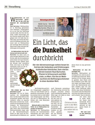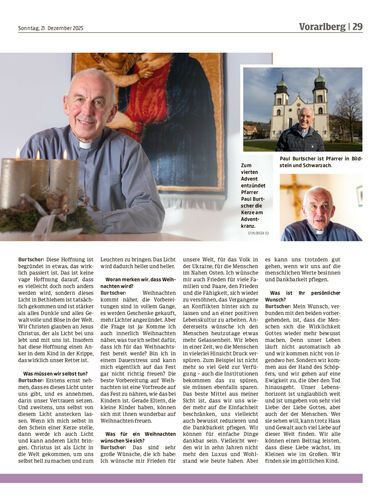 Die vier Adventsonntage stehen heuer im Zeichen der Gedanken und Erfahrungen katholischer Geistlicher. Zum vierten Advent kommt Paul Burtscher, Pfarrer in Schwarzach und Bildstein, zu Wort. Für ihn ist Weihnachten ein Hoffnungsschimmer in einer dunklen Welt.