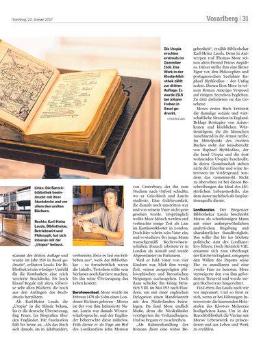 Der Engländer Thomas More hatte seine Überzeugungen – und ist dafür im Jahr 1535 gestorben. Vor 500 Jahren hat er ein berühmtes Pamphlet verfasst, die „Utopia“. Ein Exemplar hütet der Bibliothekar des Bregenzer Zisterzienserklosters Mehrerau, Karl-Heinz Lauda.