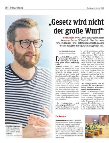 Interview. Neos-Landtagsabgeordneter Johannes Gasser (30) spricht über das neue Kinderbildungs- und -betreuungsgesetz, das im ersten Halbjahr in Begutachtung gehen soll.