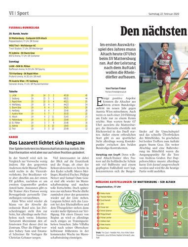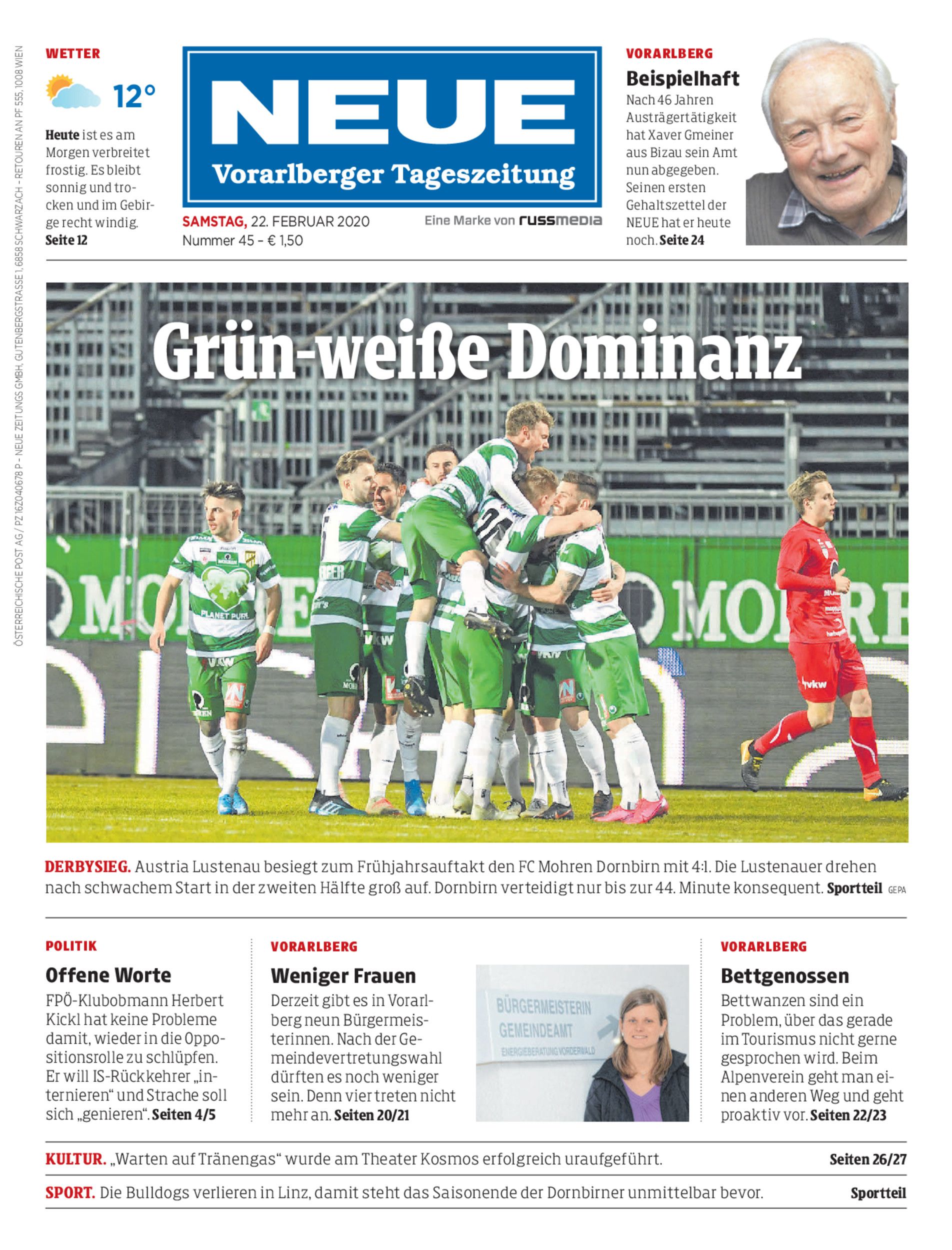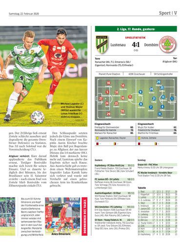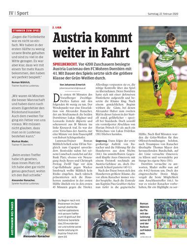 Derbysieg. Austria Lustenau besiegt zum Frühjahrsauftakt den FC Mohren Dornbirn mit 4:1. Die Lustenauer drehen nach schwachem Start in der zweiten Hälfte groß auf. Dornbirn verteidigt nur bis zur 44. Minute konsequent. Sportteil Gepa