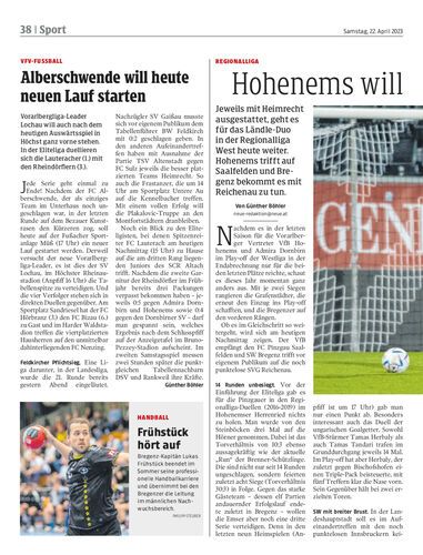 Vorarlbergliga-Leader Lochau will auch nach dem heutigen Auswärtsspiel in Höchst ganz vorne stehen. In der Eliteliga duellieren sich die Lauteracher (1.) mit den Rheindörflern (3.).