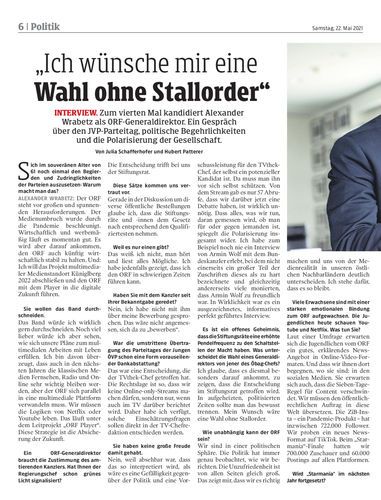 Zum vierten Mal kandidiert Alexander Wrabetz als ORF-Generaldirektor. Ein Gespräch über den JVP-Parteitag, politische Begehrlichkeiten und die Polarisierung der Gesellschaft. Von Julia Schafferhofer und Hubert Patterer