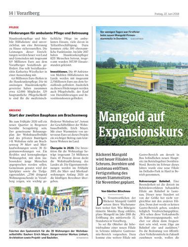 Bäckerei Mangold wird heuer Filialen in Schruns, Dornbirn und Lustenau eröffnen. Fertigstellung des neuen Stammsitzes für November geplant.