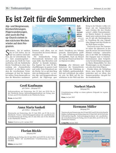 Alp- und Bergmessen, Kirchenführungen, Pilgerwanderungen, aber auch die Pop-up-Church stehen in den nächsten Wochen wieder auf dem Programm.
