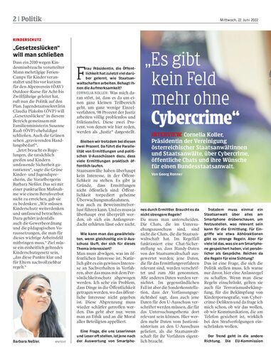 Cornelia Koller, Präsidentin der Vereinigung österreichischer Staatsanwältinnen und Staatsanwälte, über Cybercrime, öffentliche Chats und ihre Wünsche für einen Bundesstaatsanwalt. Von Georg Renner