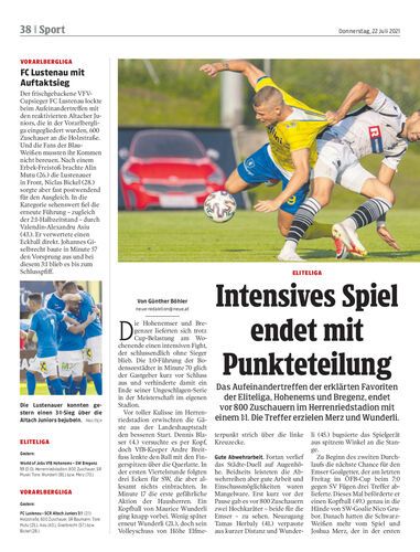 Das Aufeinandertreffen der erklärten Favoriten der Eliteliga, Hohenems und Bregenz, endet vor 800 Zuschauern im Herrenriedstadion mit einem 1:1. Die Treffer erzielen Merz und Wunderli.