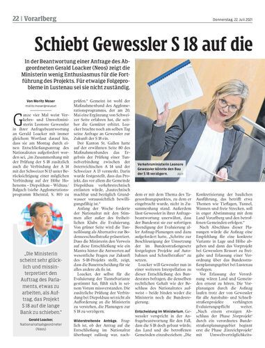 In der Beantwortung einer Anfrage des Abgeordneten Gerald Loacker (Neos) zeigt die Ministerin wenig Enthusiasmus für die Fortführung des Projekts. Für etwaige Folgeprobleme in Lustenau sei sie nicht zuständig.