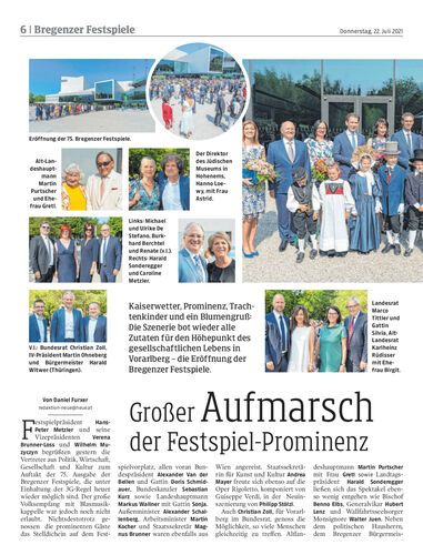 Kaiserwetter, Prominenz, Trachtenkinder und ein Blumengruß: Die Szenerie bot wieder alle Zutaten für den Höhepunkt des gesellschaftlichen Lebens in Vorarlberg – die Eröffnung der Bregenzer Festspiele.
