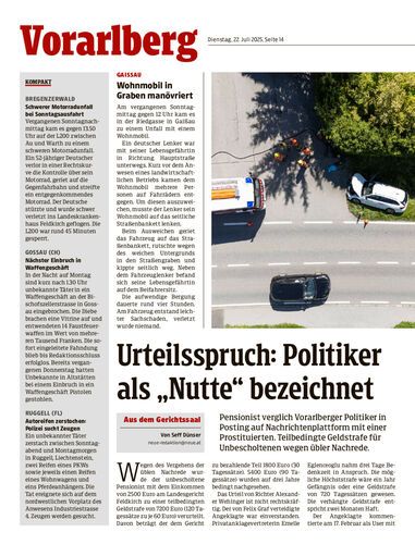 Pensionist verglich Vorarlberger Politiker in Posting auf Nachrichtenplattform mit einer Prostituierten. Teilbedingte Geldstrafe für Unbescholtenen wegen übler Nachrede.