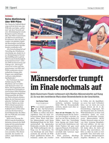 Beim Kunstturn-Finale verbessert sich Marlies Männersdorfer auf Rang 22. Es war der zweitbeste Platz einer Österreicherin in der Geschichte.