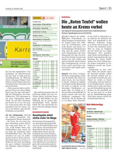Im Topspiel der 2. Liga haben die an der Tabellenspitze liegenden Lustenauer heute (20.25 Uhr) die drittplatzierten Blau-Weißen aus Linz zu Gast.
