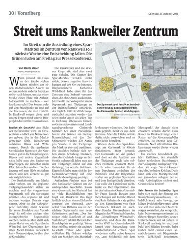 Im Streit um die Ansiedlung eines Spar-Marktes im Zentrum von Rankweil soll nächste Woche eine Entscheidung fallen. Die Grünen luden am Freitag zur Pressekonferenz.